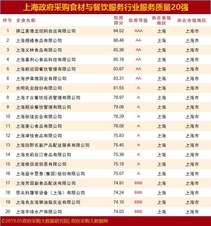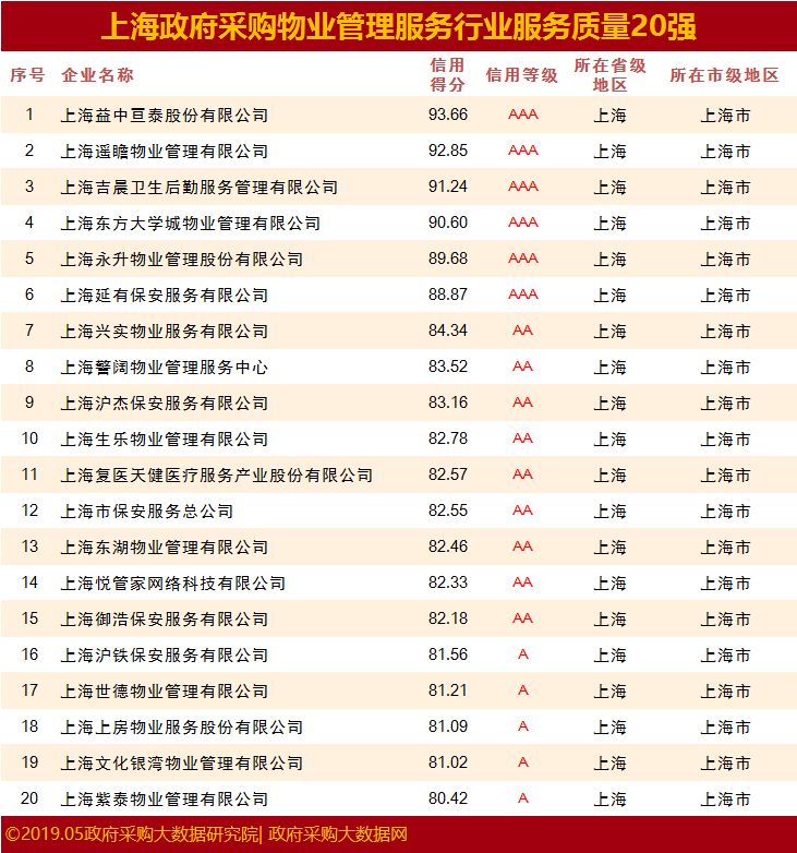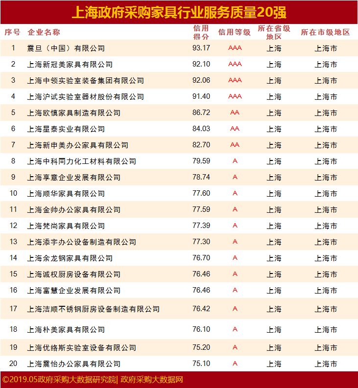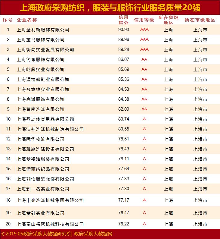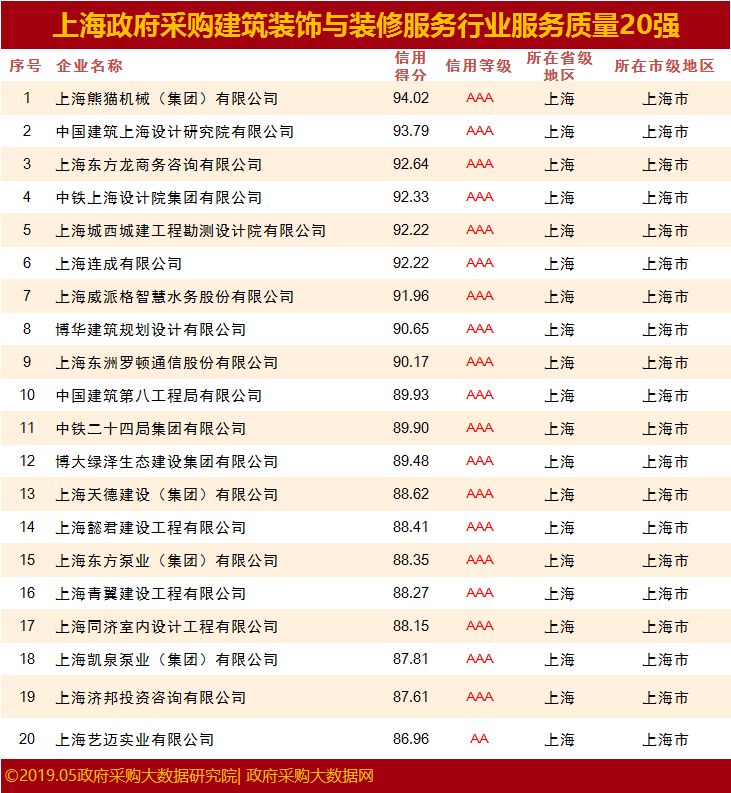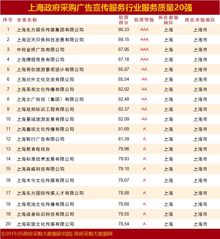 本报告(榜单)中采取全样本分析,涵盖了全国政府采购社会代理机构和供应商。本报告中的研究数据一律来源于全国各级政府采购公开信息。具体数据源包括:国家级政府采购网公开项目信息、各级地方政府部门公开采购信息中公布的公开项目信息以及信用中国网等。经政府采购大数据研究院和政府采购大数据网对企业进行政府采购大数据信用评估,为政府采购服务质量优秀的企业予以公示,联合发布:上海市政府采购服务质量100强企业&行业20强企业榜单。政府采购服务质量大数据信用报告评估期为1年,评估时段为:2018年3月1日至2019年4月30日。公示日期为:2019年5月14日至2019年5月21日。