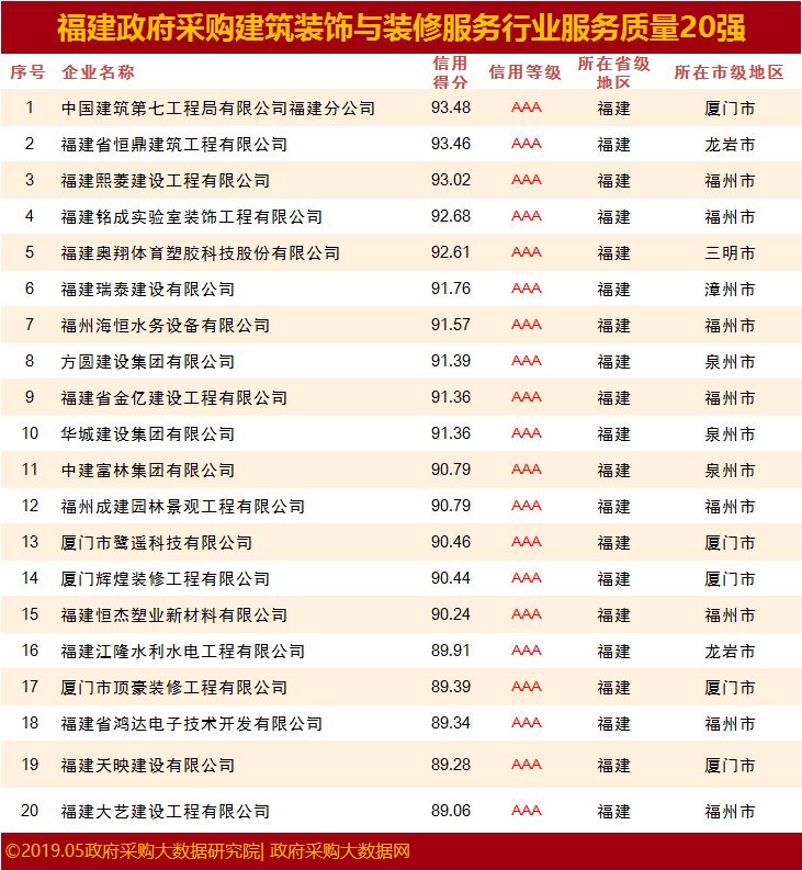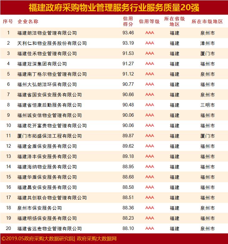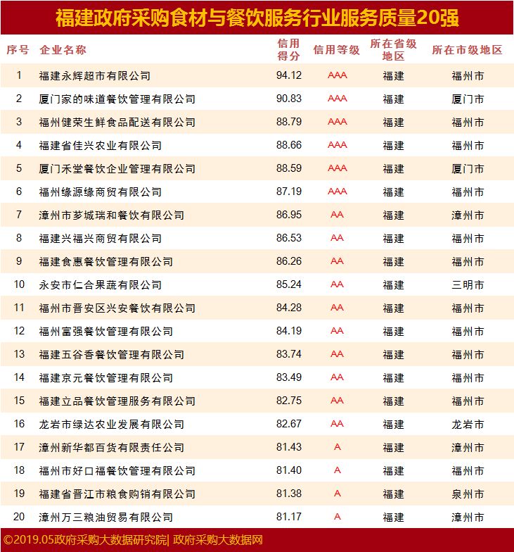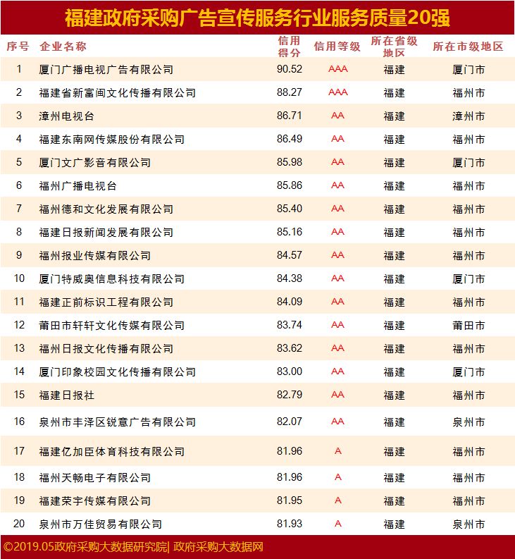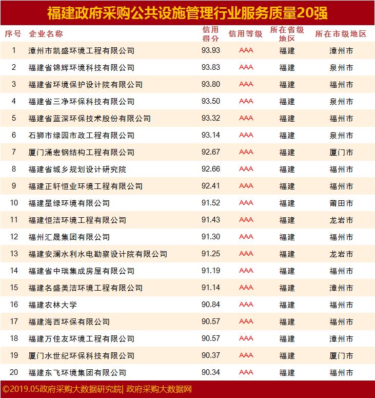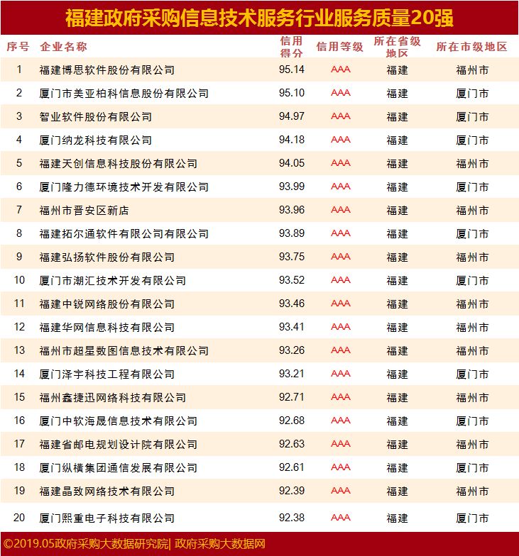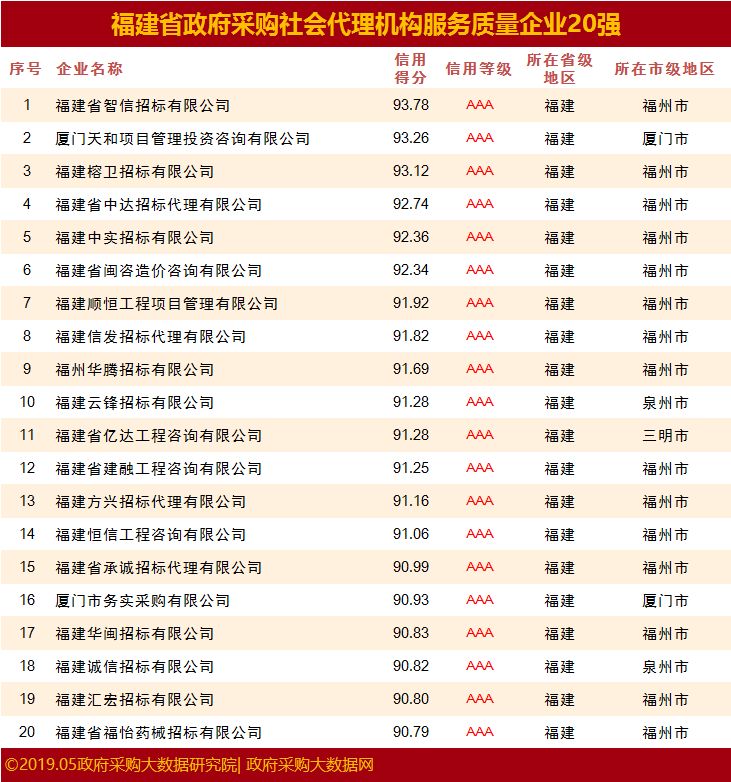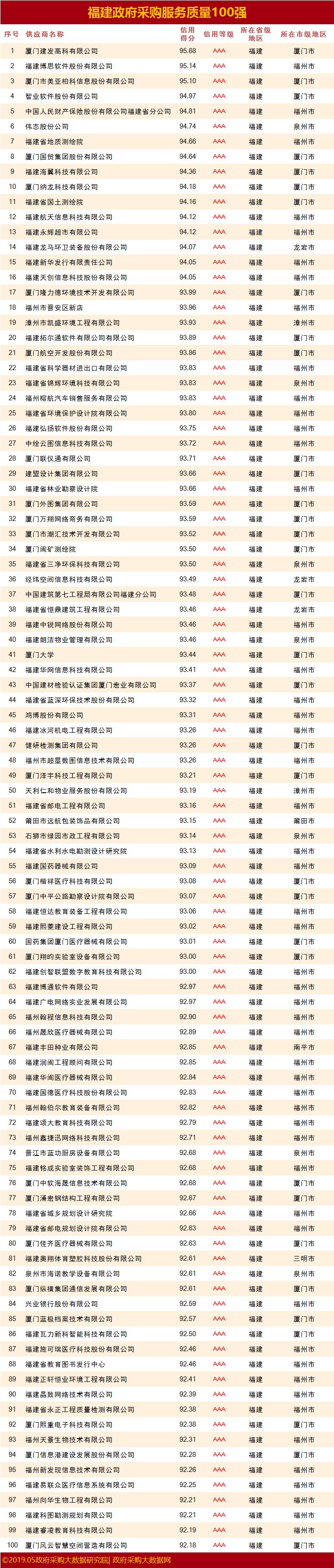 本报告(榜单)中采取全样本分析,涵盖了全国政府采购社会代理机构和供应商。本报告中的研究数据一律来源于全国各级政府采购公开信息。具体数据源包括:国家级政府采购网公开项目信息、各级地方政府部门公开采购信息中公布的公开项目信息以及信用中国网等。经政府采购大数据研究院和政府采购大数据网对企业进行政府采购大数据信用评估,为政府采购服务质量优秀的企业予以公示,联合发布:福建省政府采购服务质量100强企业&行业20强企业榜单。政府采购服务质量大数据信用报告评估期为1年,评估时段为:2018年3月1日至2019年4月30日。公示日期为:2019年5月19日至2019年5月26日。