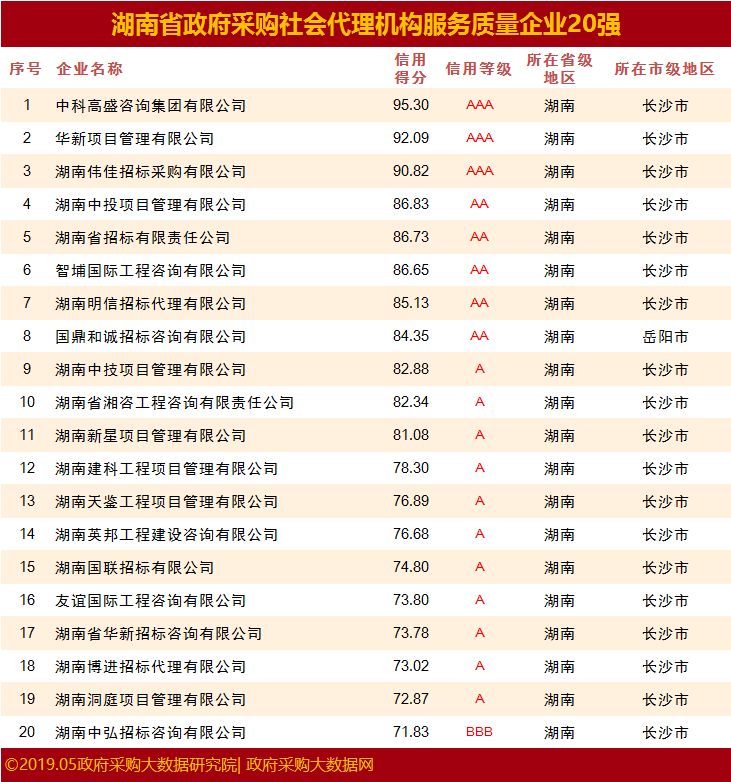 本报告(榜单)中采取全样本分析,涵盖了全国政府采购社会代理机构和供应商。本报告中的研究数据一律来源于全国各级政府采购公开信息。具体数据源包括:国家级政府采购网公开项目信息、各级地方政府部门公开采购信息中公布的公开项目信息以及信用中国网等。经政府采购大数据研究院和政府采购大数据网对企业进行政府采购大数据信用评估,为政府采购服务质量优秀的企业予以公示,联合发布:湖南省政府采购服务质量100强企业&行业20强企业榜单。政府采购服务质量大数据信用报告评估期为1年,评估时段为:2018年3月1日至2019年4月30日。公示日期为:2019年5月22日至2019年5月29日。