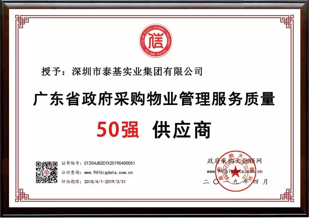 政府采购企业红名单|祝贺深圳市泰基实业集团有限公司荣获广东省政府采购物业管理服务质量50强供应商!