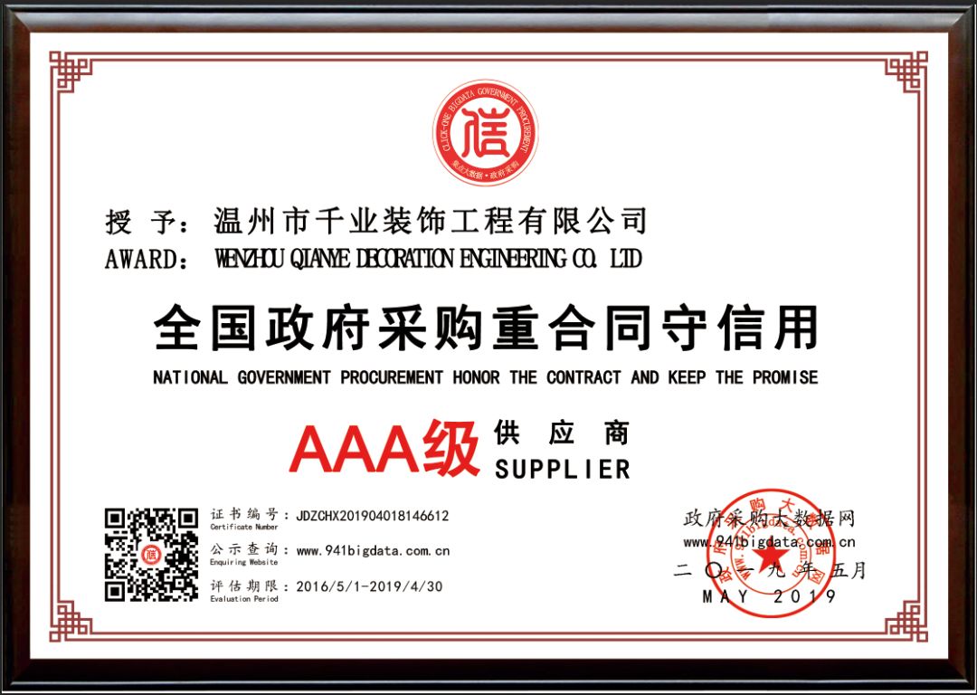 政府采购企业红名单|祝贺温州市千业装饰工程有限公司荣获全国政府采购重合同守信用AAA级供应商!