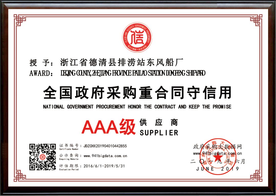 经政府采购大数据网&政府采购大数据研究院&广东集点网络科技有限公司三方联合评价,浙江省德清县排涝站东风船厂被第三方政府采购大数据信用评级机构“集点大数据信用”评定为全国政府采购重合同守信用AAA级供应商!