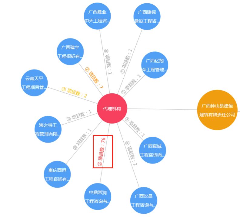 广西钟山县建恒建筑有限责任公司关联预警图监测出在各代理机构的中标数。其中合作最突出的代理机构是中鼎誉润工程咨询有限公司。