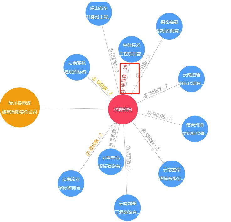 企业关联预警图动态显示出近两年供应商陇川县恒源建筑有限责任公司与代理机构中科标禾工程项目管理有限公司的合作关系最密切: