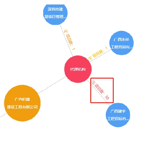广西和鑫建设工程有限公司关联预警图监测到与代理机构广西建宇工程招标有限公司的关联度最高: