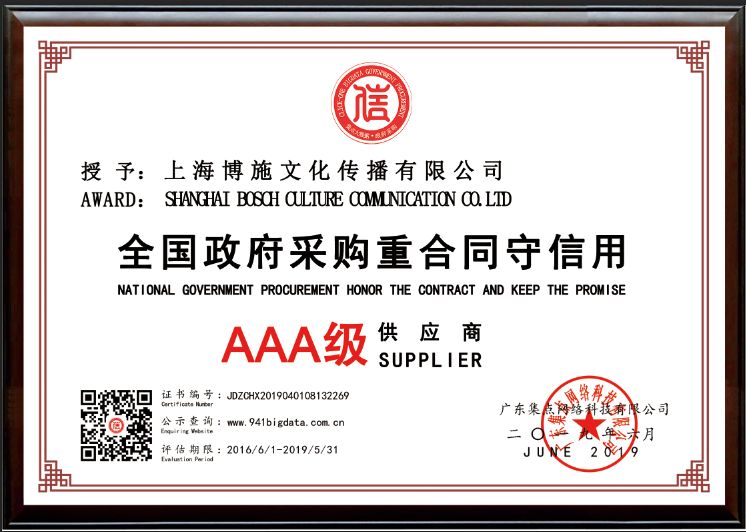 经集点政府采购大数据网&集点政府采购大数据研究院&广东集点网络科技有限公司三方联合评价,上海博施文化传播有限公司被第三方政府采购大数据信用评级机构“集点大数据信用”评定为全国政府采购重合同守信用AAA级供应商!