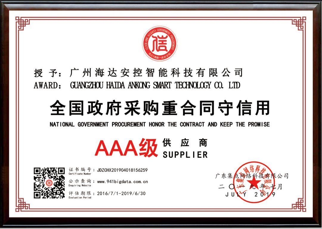 经集点政府采购大数据网&集点政府采购大数据研究院&广东集点网络科技有限公司三方联合评价,广州海达安控智能科技有限公司被第三方政府采购大数据信用评级机构“集点大数据信用”评定为全国政府采购重合同守信用AAA级供应商!