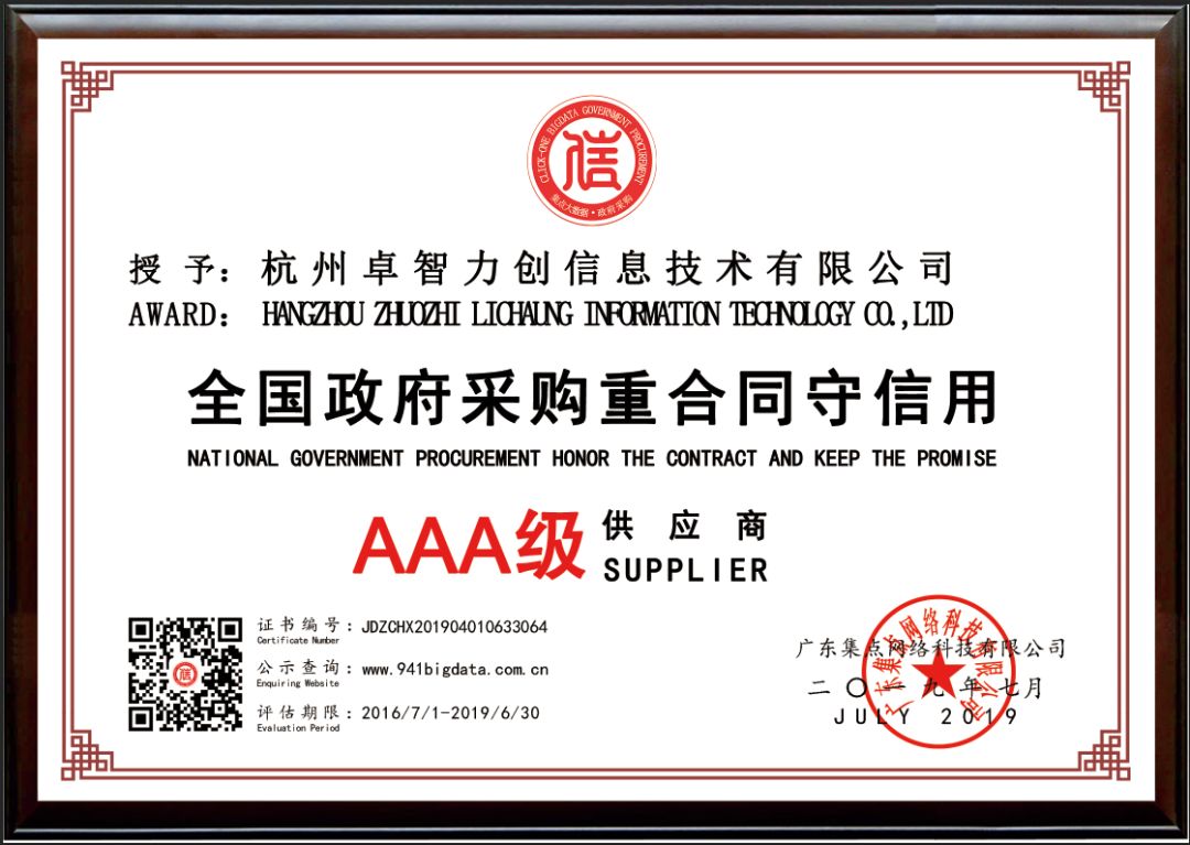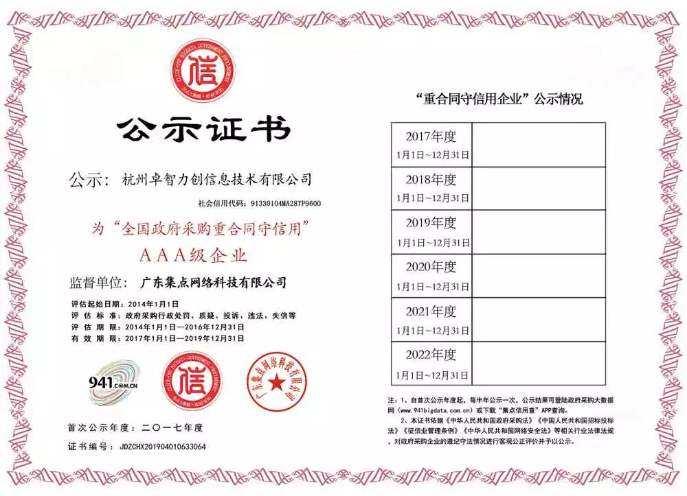 政府采购企业红名单|祝贺杭州卓智力创信息技术有限公司荣获全国政府采购重合同守信用AAA级供应商!