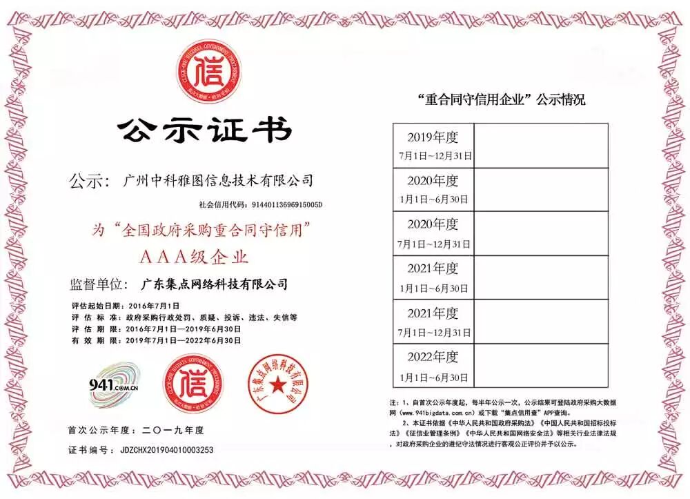 政府采购企业红名单|祝贺广州中科雅图信息技术有限公司荣获全国政府采购重合同守信用AAA级供应商!