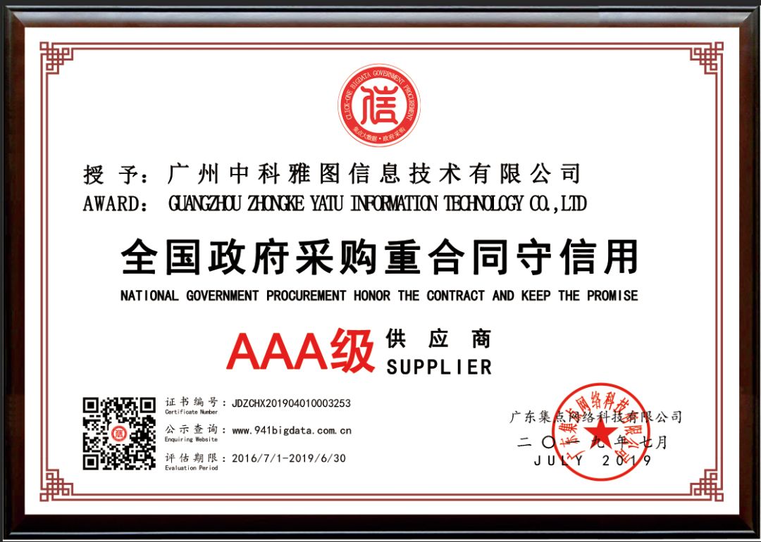 经政府采购大数据网&政府采购大数据研究院&广东集点网络科技有限公司三方联合评价,广州中科雅图信息技术有限公司被第三方政府采购大数据信用评级机构“集点大数据信用”评定为全国政府采购重合同守信用AAA级供应商!