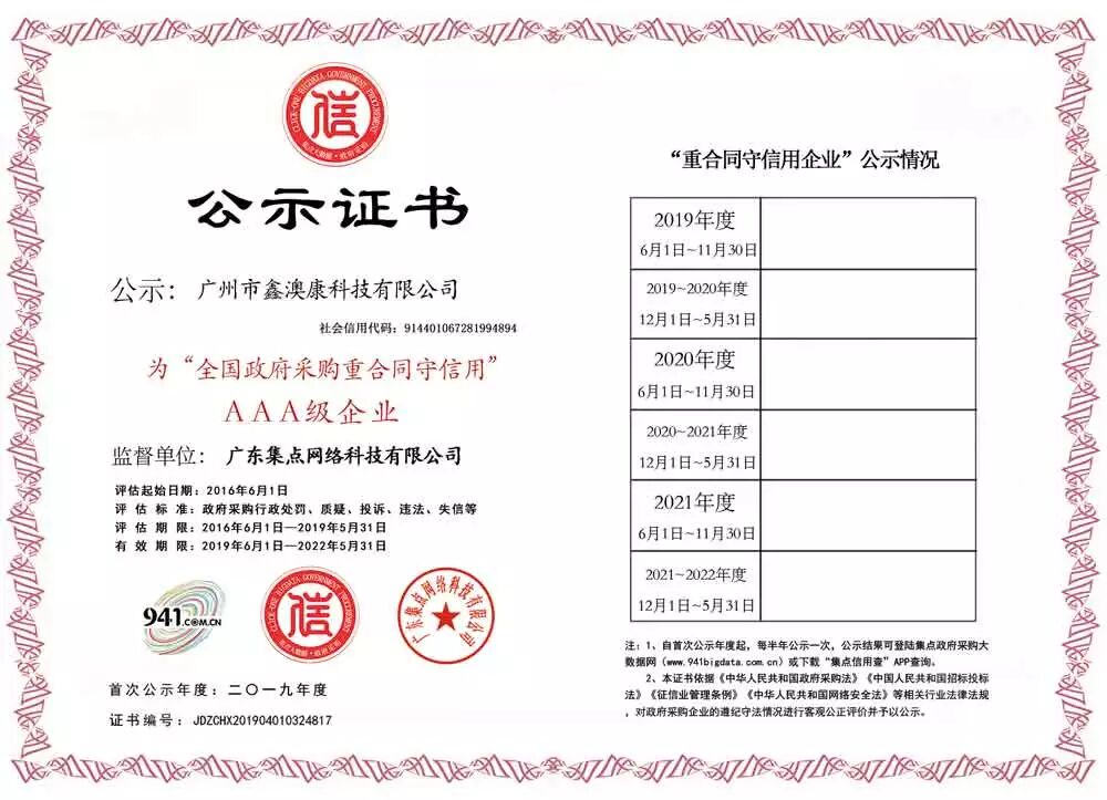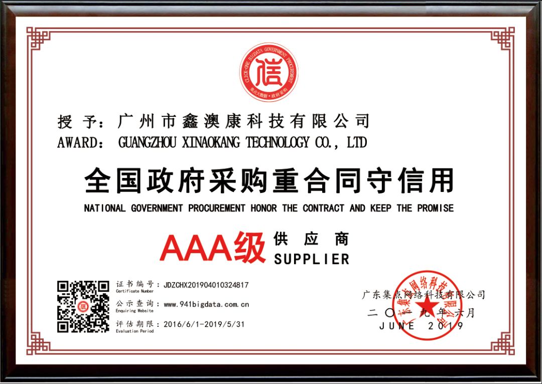 经政府采购大数据网&政府采购大数据研究院&广东集点网络科技有限公司三方联合评价,广州市鑫澳康科技有限公司被第三方政府采购大数据信用评级机构“集点大数据信用”评定为全国政府采购重合同守信用AAA级供应商!