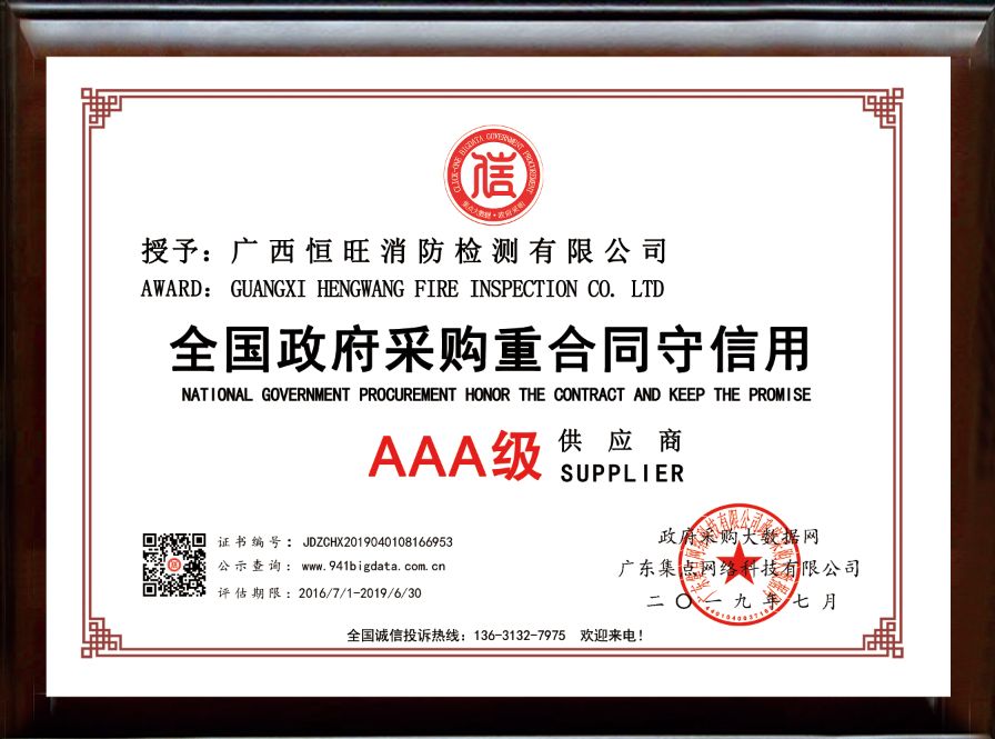 经政府采购大数据网&政府采购大数据研究院&广东集点网络科技有限公司三方联合评价,广西恒旺消防检测有限公司被第三方政府采购大数据信用评级机构“集点大数据信用”评定为全国政府采购重合同守信用AAA级供应商!
