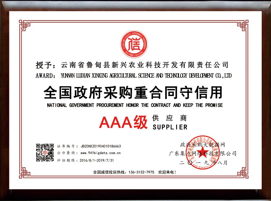 经政府采购大数据网&政府采购大数据研究院&广东集点网络科技有限公司三方联合评价,云南省鲁甸县新兴农业科技开发有限责任公司被第三方政府采购大数据信用评级机构“集点大数据信用”评定为全国政府采购重合同守信用AAA级供应商!