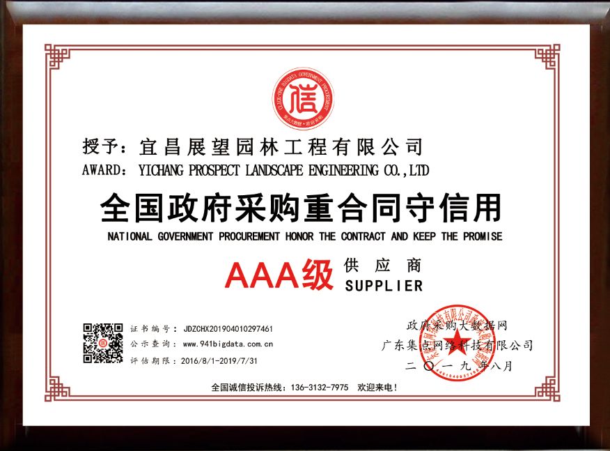 经政府采购大数据网&政府采购大数据研究院&广东集点网络科技有限公司三方联合评价,宜昌展望园林工程有限公司被第三方政府采购大数据信用评级机构“集点大数据信用”评定为全国政府采购重合同守信用AAA级供应商!