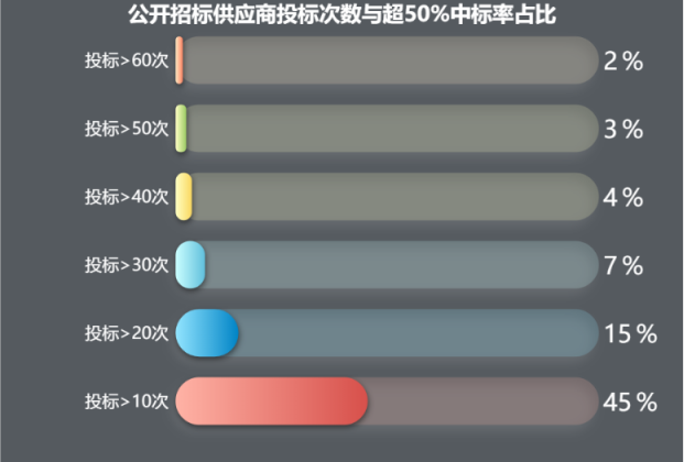 公开招标下,投标10次以上的供应商,中标达到了7315家,其中中标率超50%共有3318家,占比达到45.36%。数据显示,投标次数越少的供应商,反而中标率相对较高。
