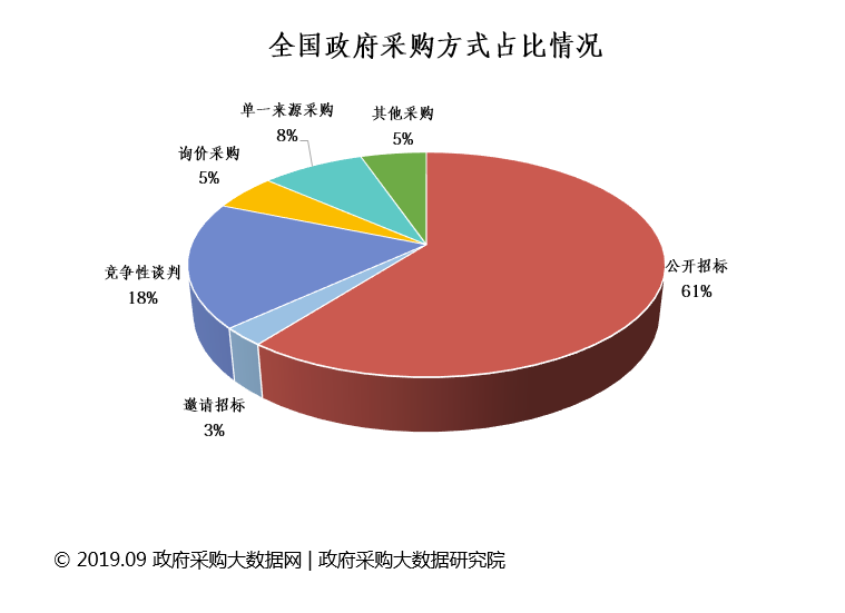 公开招标是政府采购主要的采购方式,政府采购大数据网动态监测显示:2018年以来(即2018.01.01-2019.09.24期间),全国政府采购公开招标方式比重达到61%,公开招标占主导地位。