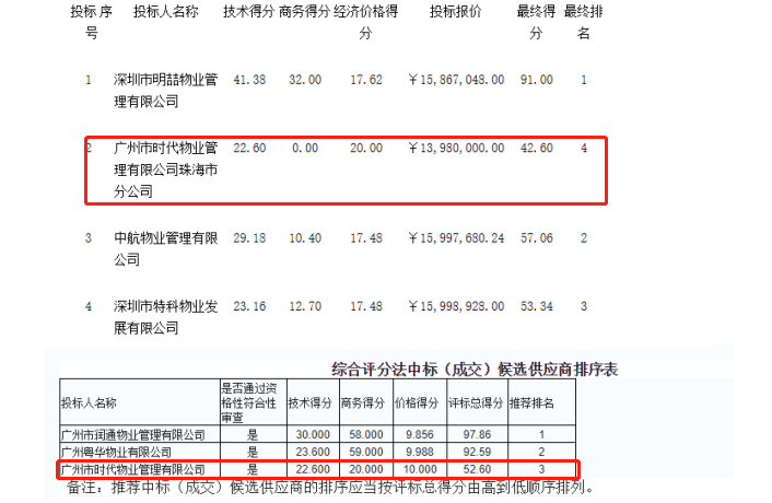广州市时代物业管理有限公司共投标117次,仅中标3个,中标率2.56%。中标候选人综合得分差距明显。