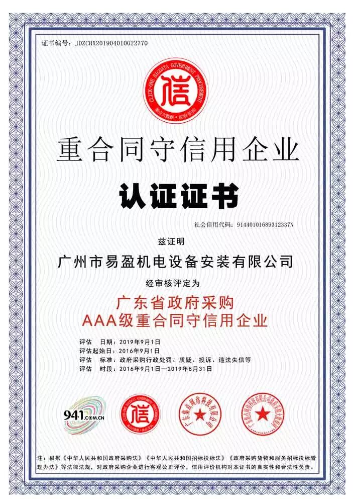 经政府采购大数据网&政府采购大数据研究院&广东集点网络科技有限公司三方联合评价:①广州市易盈机电设备安装有限公司被第三方政府采购大数据信用评级机构“集点大数据信用”评定为广东省政府采购AAA级重合同守信用企业!