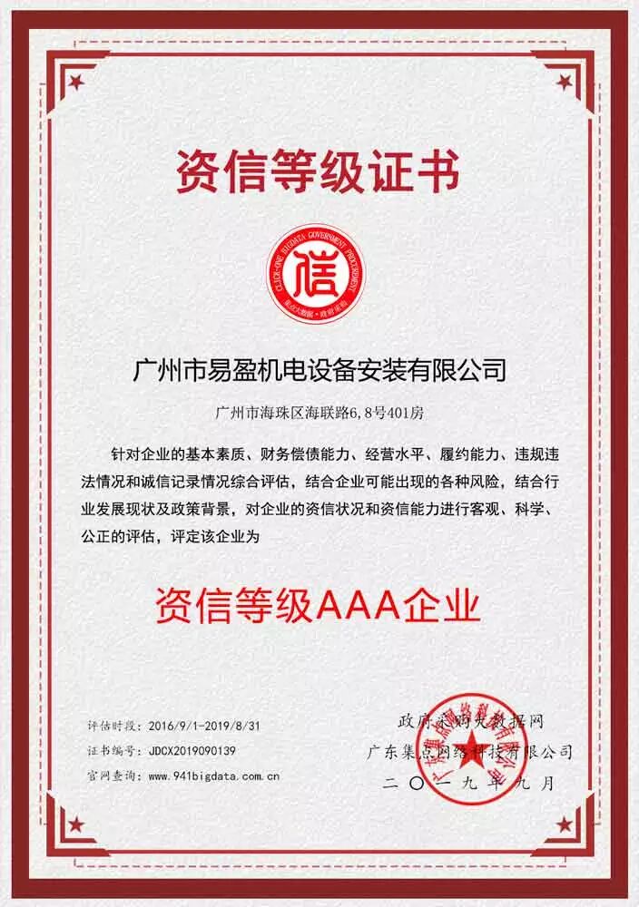 ②广州市易盈机电设备安装有限公司被第三方政府采购大数据信用评级机构“集点大数据信用”评定为资信等级AAA企业!