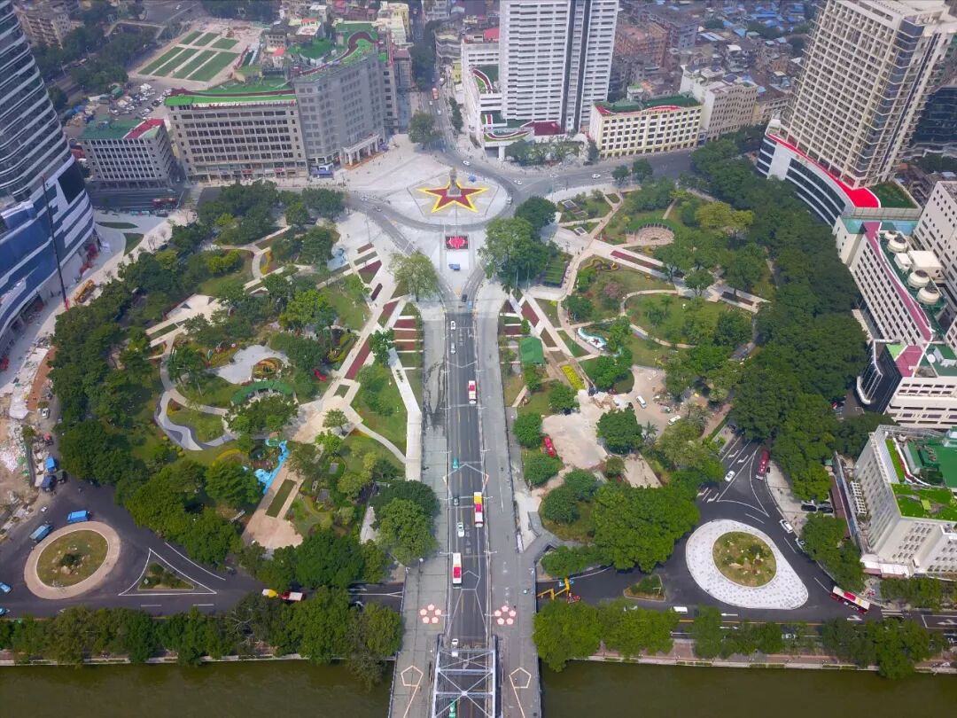 2019年9月26日下午,经过三个月的改造,海珠广场终于露出真容。从高空俯瞰,广州解放纪念碑塑像底座四周以鲜花铺设了一个镶黄边的巨大红五角星,塑像前方地面的路径和花带向珠江呈放射状布局,各种花卉树木点缀其中,动感十足。广州日报全媒体记者 骆昌威摄
