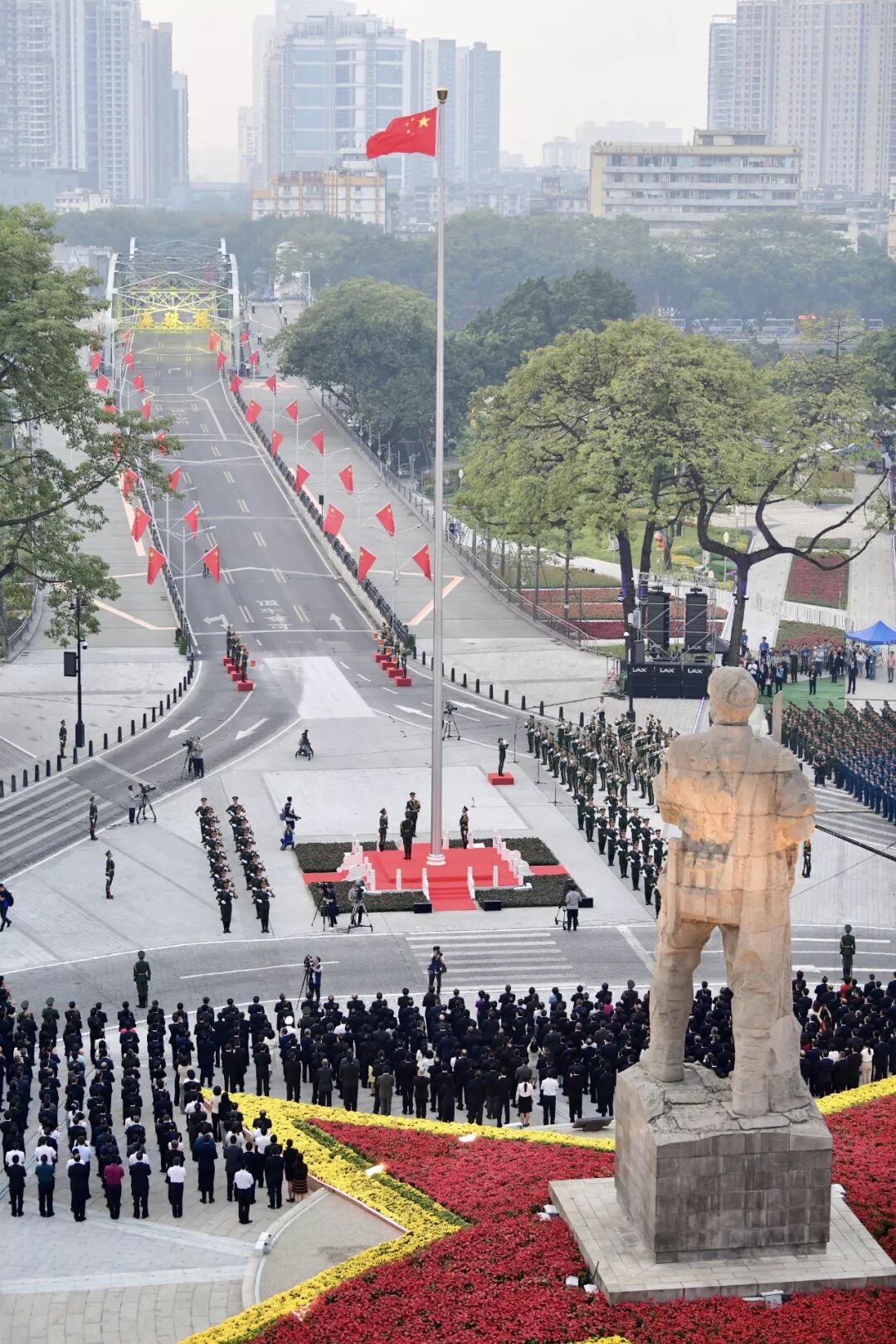 10月1日早上,广东省、广州市庆祝中华人民共和国成立70周年升旗仪式在广州市越秀区海珠广场隆重举行,致敬国旗,祝福祖国。广东省、广州市各界群众代表约2000余人参加。