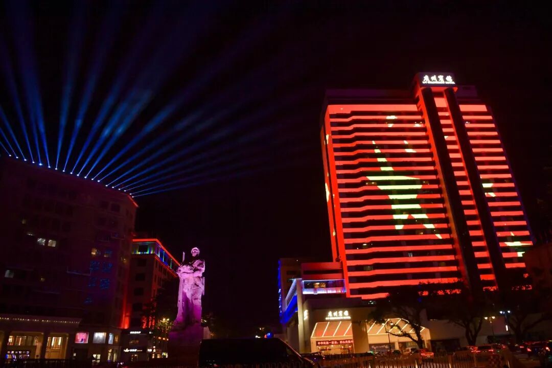 | 9月24日,海珠广场试亮灯,五星红旗“飘上”广州宾馆。广州日报全媒体记者 王燕摄 |