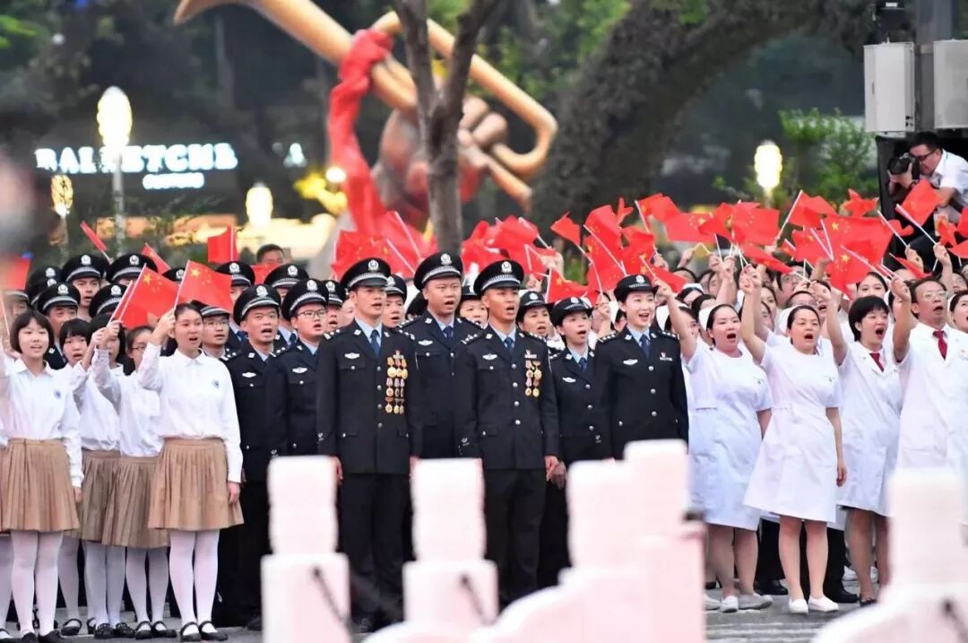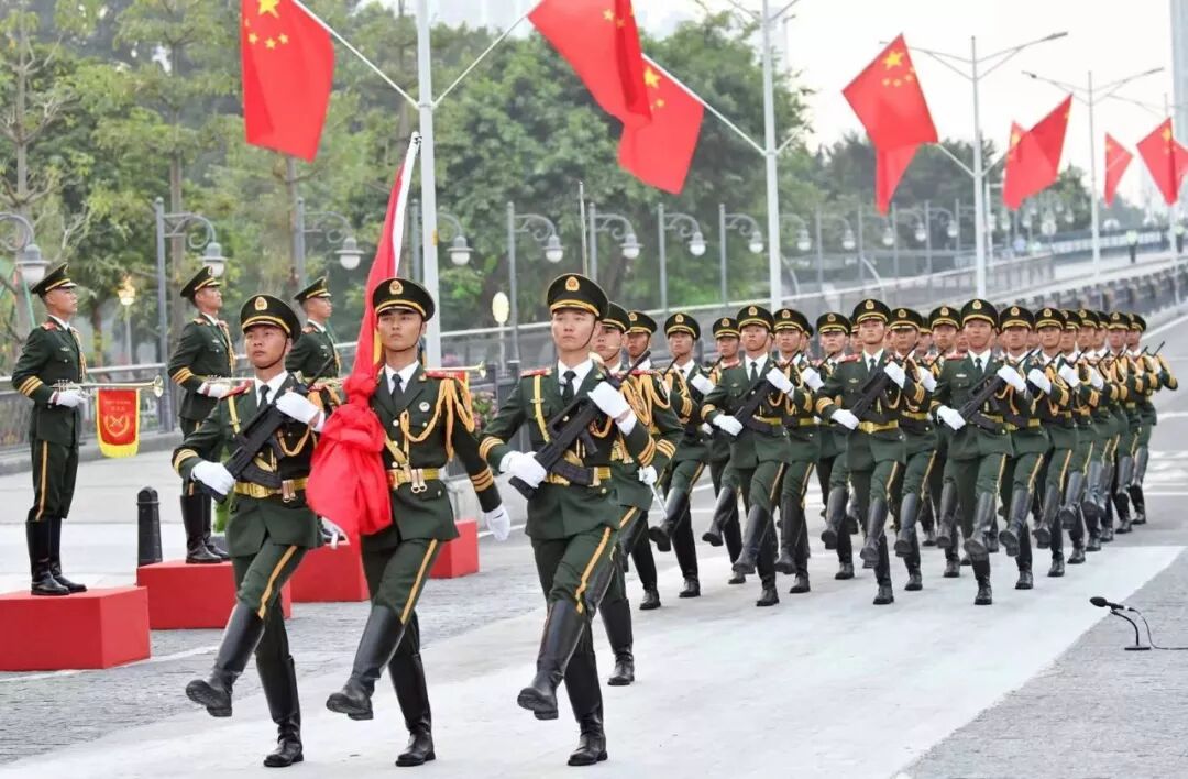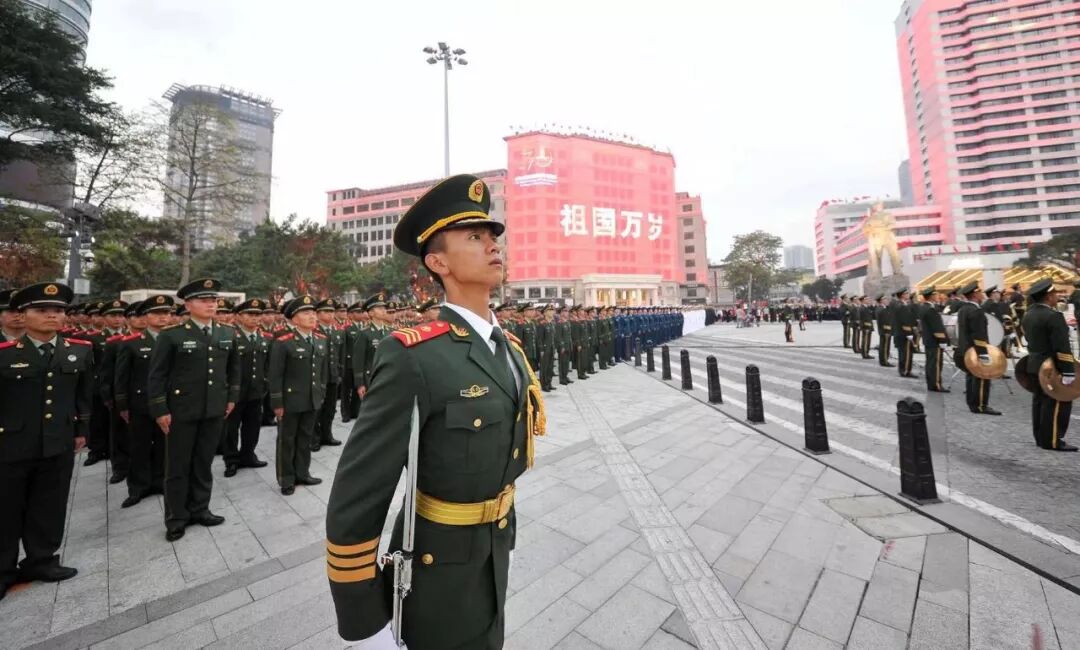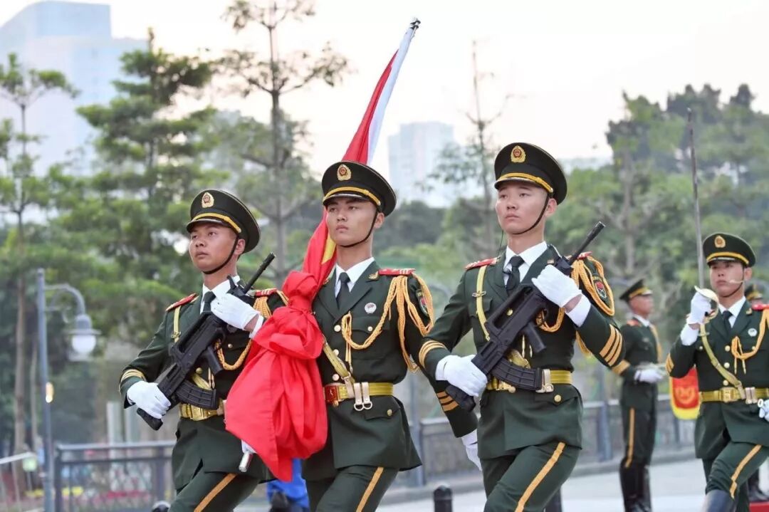 广州日报记者了解到,此次武警广东省总队机动支队提前18天受领升国旗的紧急任务,马上为此抽调精兵强将,组成了总人数为52人的国旗护卫队参加仪式,包括带刀指挥官、擎旗手、护旗手和护卫队员。军乐队由50名军乐手与1名指挥组成,同样来自武警广东省总队机动支队。
