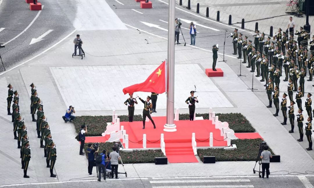 五星红旗在雄壮的《义勇军进行曲》中冉冉升起,迎风飘扬。现场,全体肃立,32名护卫队员和两名护旗手行“握枪礼”,带刀指挥员行“举刀礼”,军警行军礼、少先队员行队礼、群众及其他人员行注目礼,表达对伟大祖国的深刻祝福。