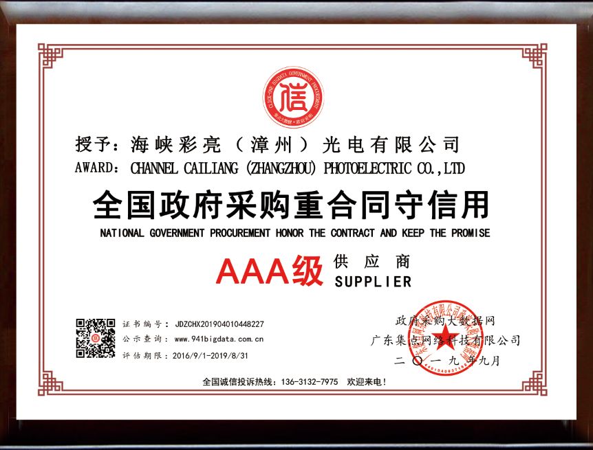 经政府采购大数据网&政府采购大数据研究院&广东集点网络科技有限公司三方联合评价,海峡彩亮(漳州)光电有限公司被第三方政府采购大数据信用评级机构“集点大数据信用”评定为全国政府采购重合同守信用AAA级供应商!