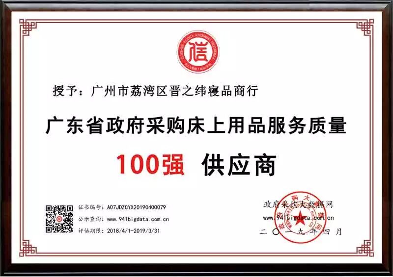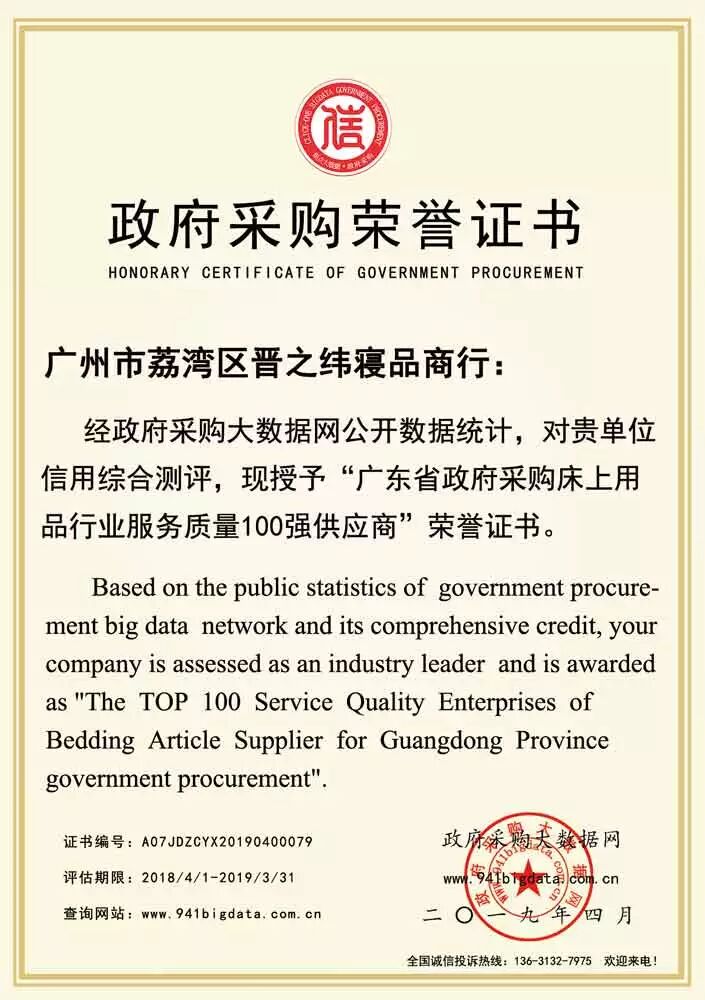 经政府采购大数据网&政府采购大数据研究院&广东集点网络科技有限公司三方联合评价,广州市荔湾区晋之纬寝品商行被第三方政府采购大数据信用评级机构“集点大数据信用”评定为广东省政府采购床上用品服务质量100强供应商!