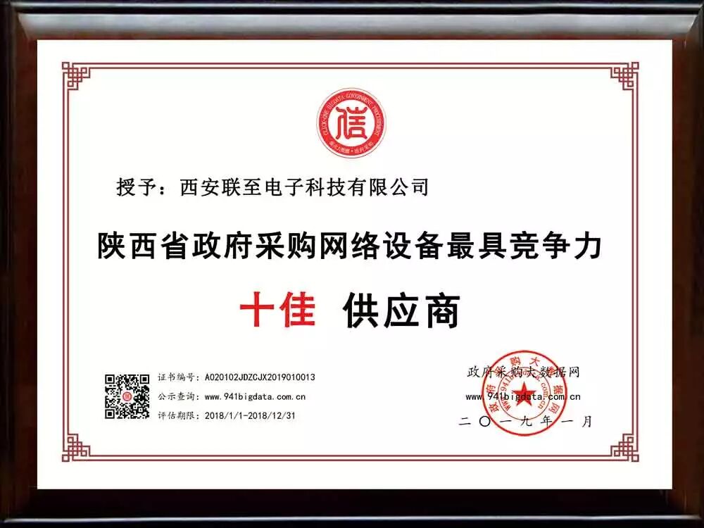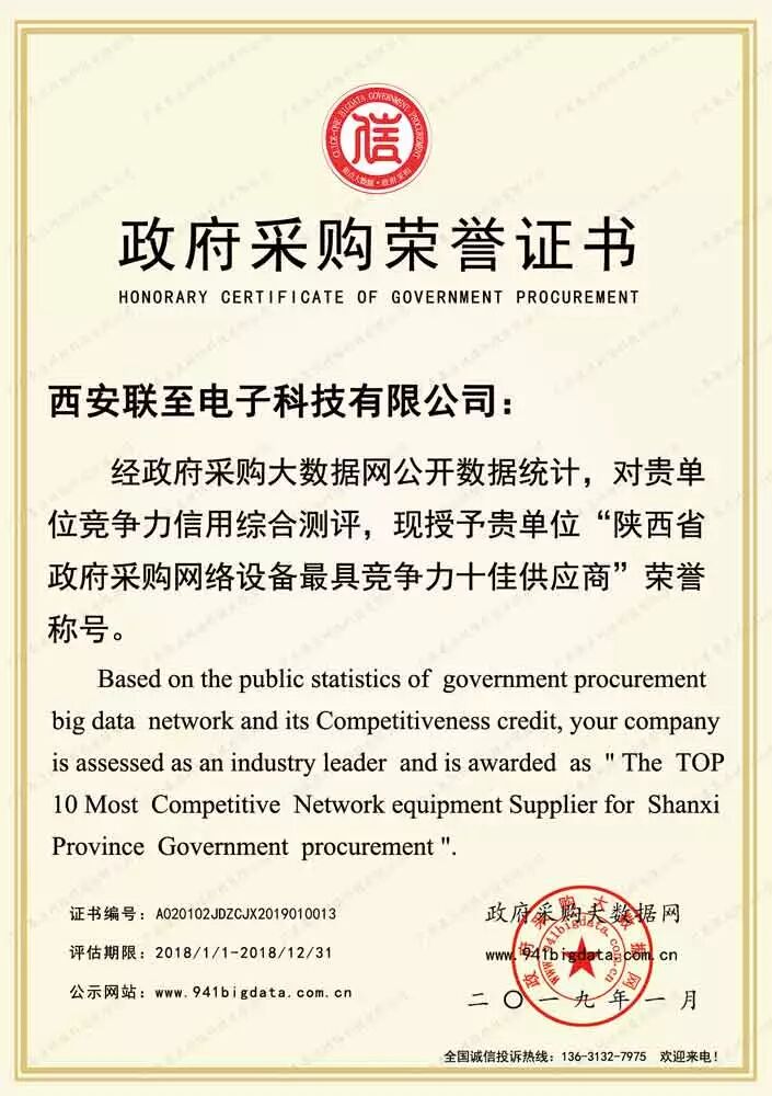 经政府采购大数据网&政府采购大数据研究院&广东集点网络科技有限公司三方联合评价:西安联至电子科技有限公司被第三方政府采购大数据信用评级机构“集点大数据信用”评定为陕西省政府采购网络设备最具竞争力十佳供应商!