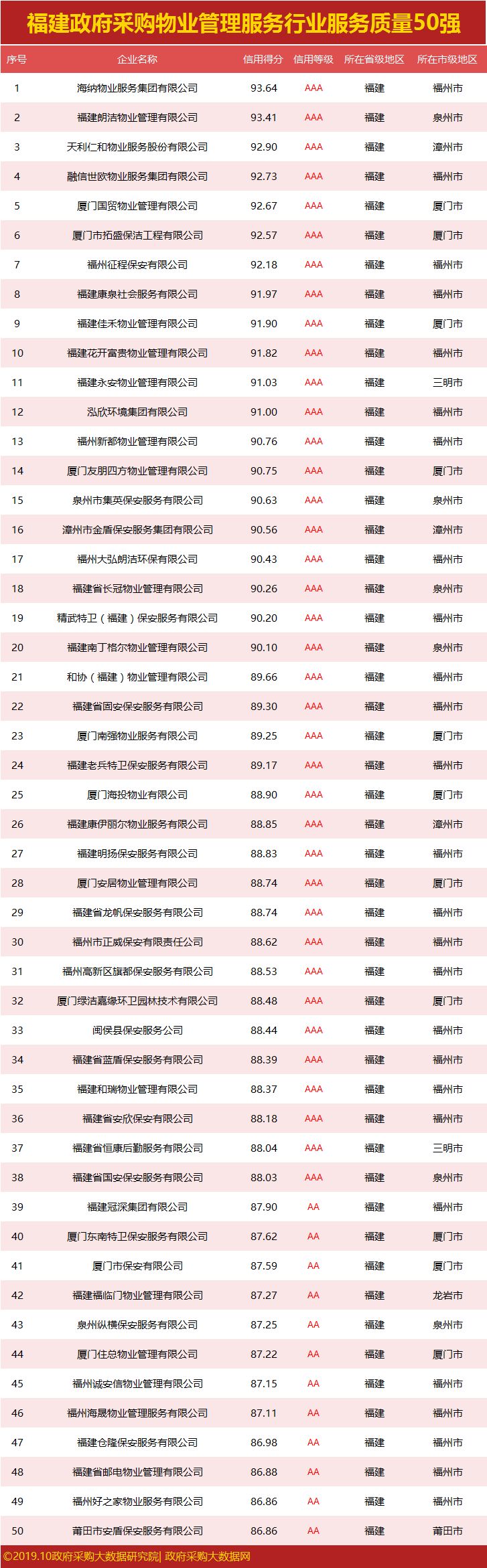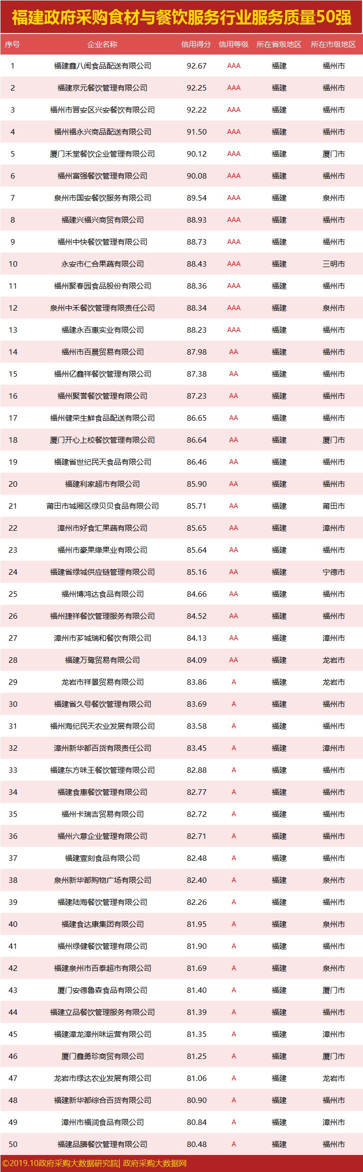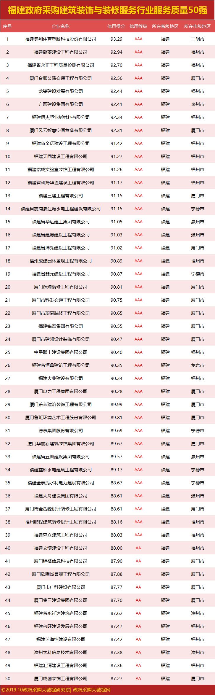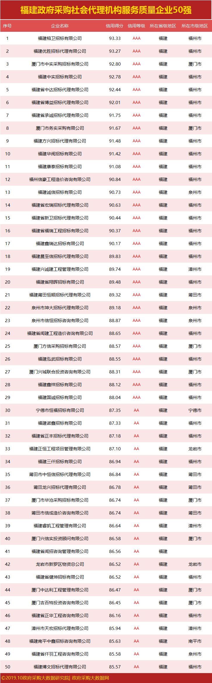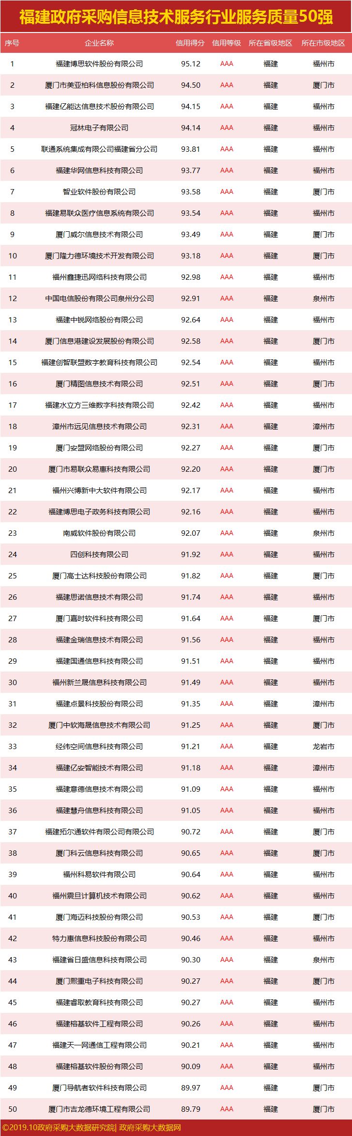 经政府采购大数据研究院和政府采购大数据网通过政府采购大数据信用评估,对福建省政府采购行业服务质量优秀的企业予以公示。政府采购服务质量大数据评估期为1年,评估时段为:2018年10月01日至2019年09月30日。公示日期为:2019年10月11日至2019年10月17日。