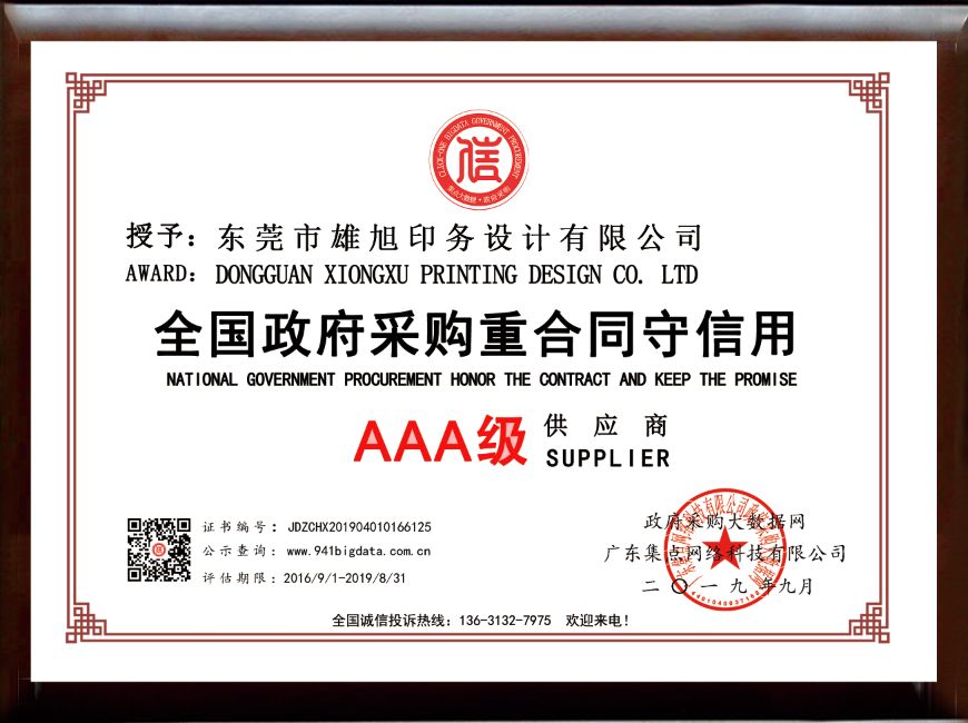 经政府采购大数据网&政府采购大数据研究院&广东集点网络科技有限公司三方联合评价,东莞市雄旭印务设计有限公司和贵州金正房地产资产评估事务所被第三方政府采购大数据信用评级机构“集点大数据信用”评定为全国政府采购重合同守信用AAA级供应商!
