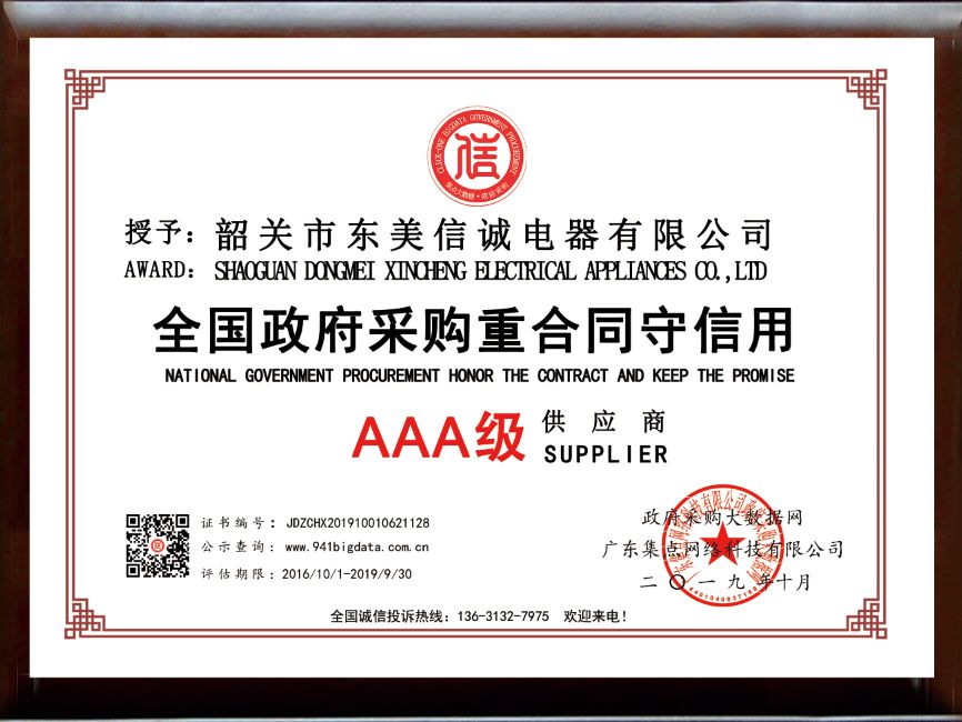 经政府采购大数据网&政府采购大数据研究院&广东集点网络科技有限公司三方联合评价,韶关市东美信诚电器有限公司被第三方政府采购大数据信用评级机构“集点大数据信用”评定为全国政府采购重合同守信用AAA级供应商!