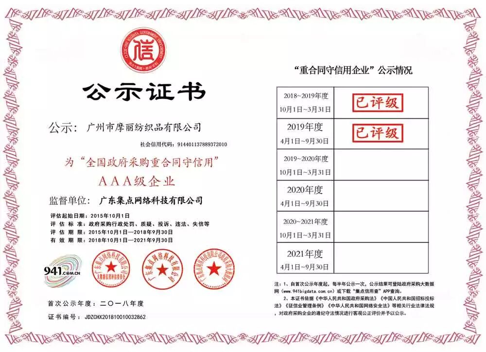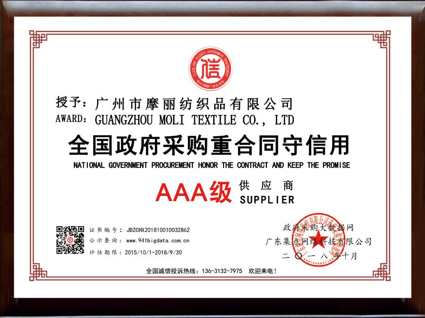 经政府采购大数据网&政府采购大数据研究院&广东集点网络科技有限公司三方联合评价,广州市摩丽纺织品有限公司被第三方政府采购大数据信用评级机构“集点大数据信用”评定为全国政府采购重合同守信用AAA级供应商!