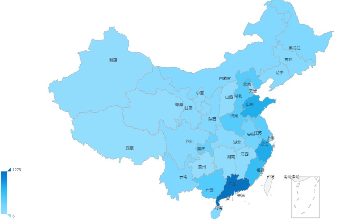 物业管理行业采购项目数有所增加,2019上半年采购项目共7607个,较上年同期增长11.51%。地区分布来看,2018上半年和2019上半年广东、浙江和山东项目数均位居全国前三。总体上沿海地区项目数分布相对突出。