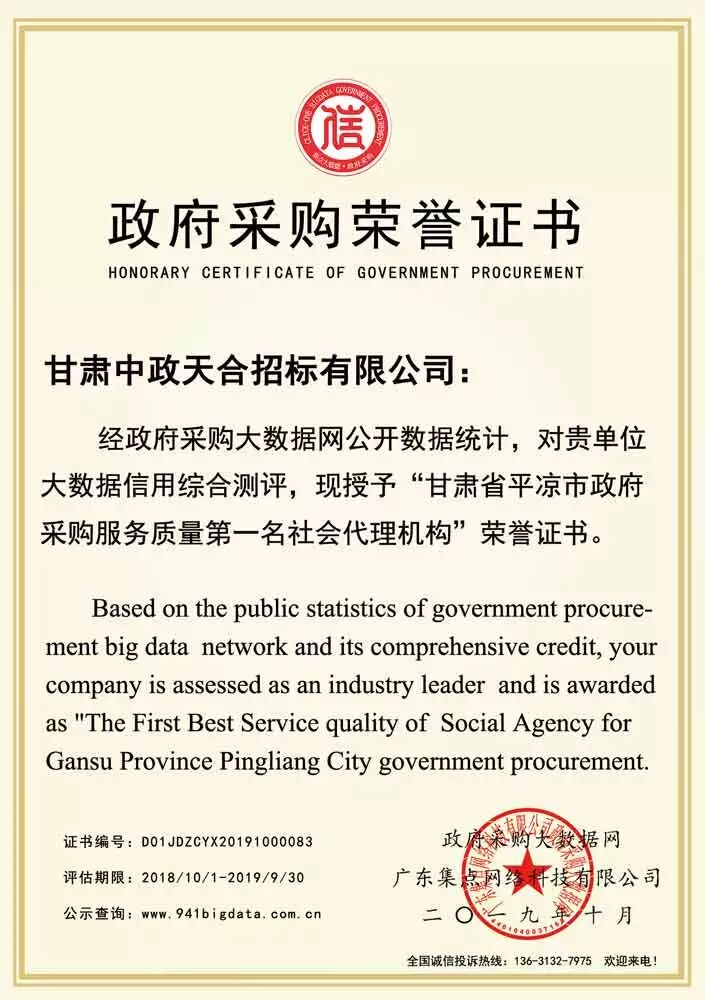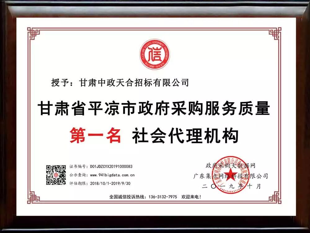 经政府采购大数据网&政府采购大数据研究院&广东集点网络科技有限公司三方联合评价:甘肃中政天合招标有限公司被第三方政府采购大数据信用评级机构“集点大数据信用”评定为:甘肃省平凉市政府采购服务质量第一名社会代理机构!