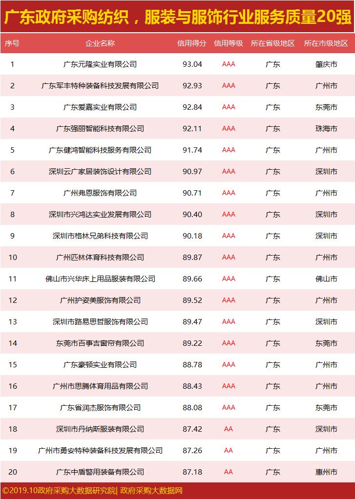 广东政府采购纺织,服装与服饰行业服务质量 TOP20