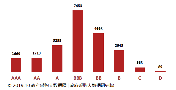 广东政府采购服务质量企业总体样本容量达到22088家,A级及以上信用等级单位6637家,占总体样本的30.05%。B级及以上信用等级单位21431家,占总体样本的97.03%。从数据来看,广东政府采购绝大部分企业服务质量信用表现良好。