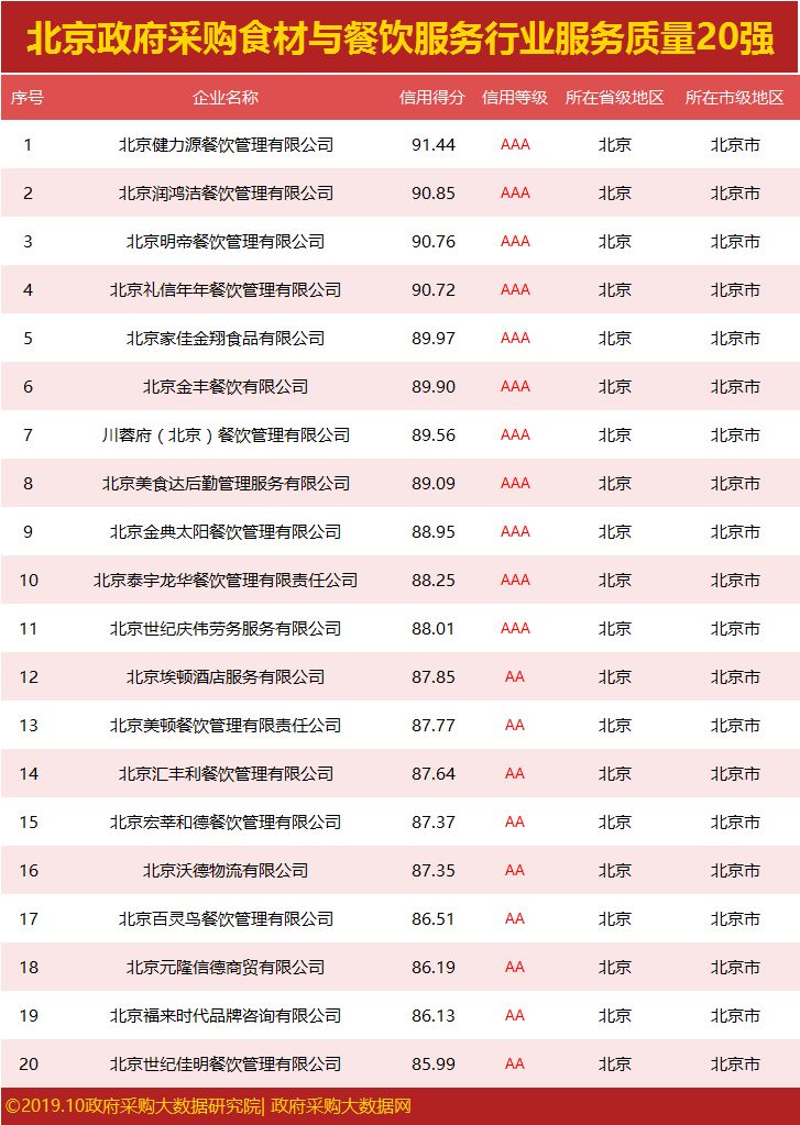 北京政府采购食材与餐饮服务行业服务质量 TOP20