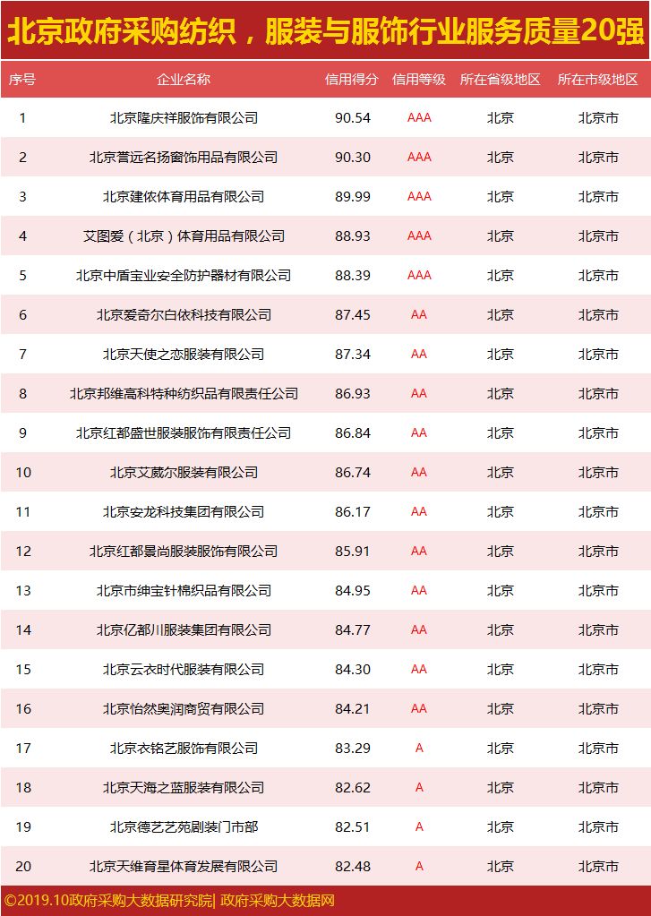 北京政府采购纺织,服装与服饰行业服务质量 TOP20