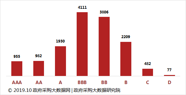 浙江政府采购服务质量企业总体样本容量达到14552家,A级及以上信用等级单位3867家,占总体样本的26.57%。B级及以上信用等级单位13993家,占总体样本的96.16%。数据显示,浙江政府采购总体上企业服务质量信用表现良好。