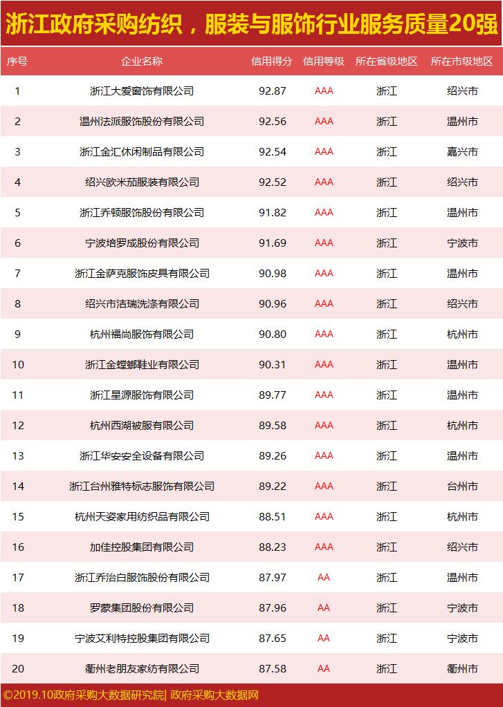 浙江政府采购纺织,服装与服饰行业服务质量 TOP20