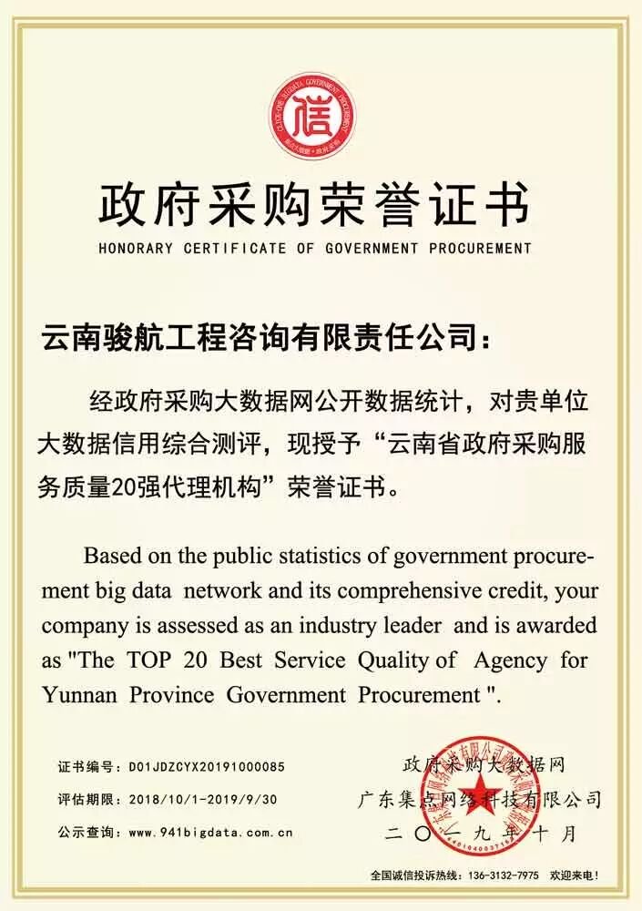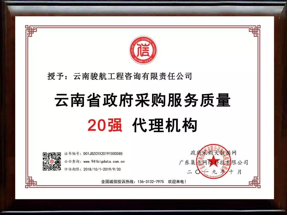 经政府采购大数据网&政府采购大数据研究院&广东集点网络科技有限公司三方联合评价,云南骏航工程咨询有限责任公司被第三方政府采购大数据信用评级机构“集点大数据信用”评定为云南省政府采购服务质量20强代理机构!