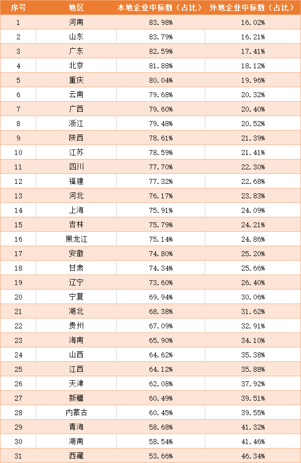 政府采购大数据网显示:2019年以来,全国各地区采购项目由本地区供应商中标的占比平均为72.35%。其中,河南省政府采购中由本地企业中标的项目数占比高达83.98%,占领全国第一的位置。由下表可见,前5个地区由本地企业中标的占比均超80%。