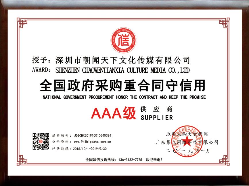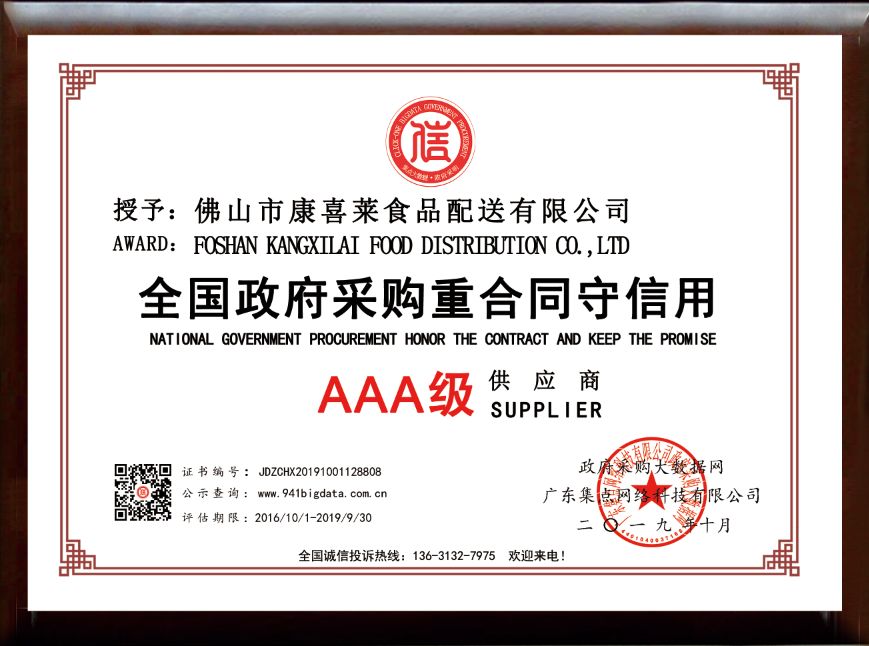 经政府采购大数据网&政府采购大数据研究院&广东集点网络科技有限公司三方联合评价,佛山市康喜莱食品配送有限公司和深圳市朝闻天下文化传媒有限公司被第三方政府采购大数据信用评级机构“集点大数据信用”评定为全国政府采购重合同守信用AAA级供应商!