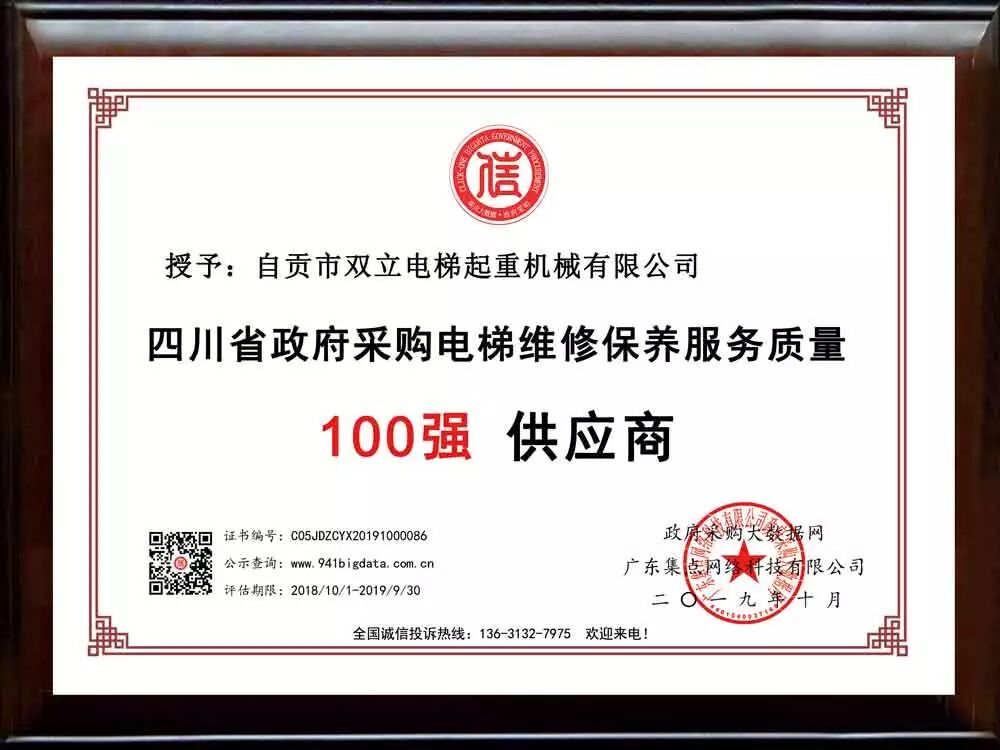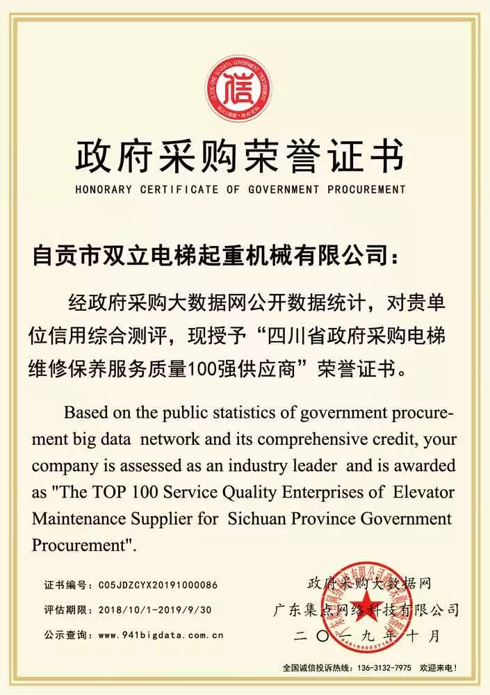 经政府采购大数据网&政府采购大数据研究院&广东集点网络科技有限公司三方联合评价: 自贡市双立电梯起重机械有限公司被第三方政府采购大数据信用评级机构“集点大数据信用”评定为四川省政府采购电梯维修保养服务质量100强供应商!