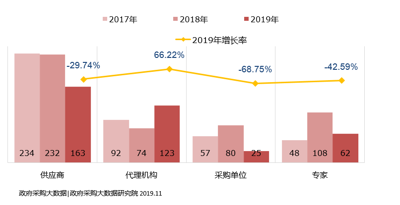 ②2019年1-10月份供应商、采购单位和专家的失信数量与上年同期相比均呈下降态势,尤其采购单位失信数下降幅度达到68.75%。但代理机构失信记录比上年同期增长了68.75%,可见,对代理机构的失信惩治将进一步加强。