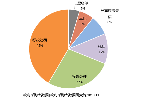 ①2019年1-10月失信处罚类型中行政处罚较上年同期有所减少,但仍占主流地位,比重达到42%;投诉处理所占份额为27%,与上年同比增长24.39%。随着政府采购信息公开力度的加强,供应商维权意识的提高,加之投诉渠道的拓宽,投诉程序的简化;投诉处理的比重将继续扩大。