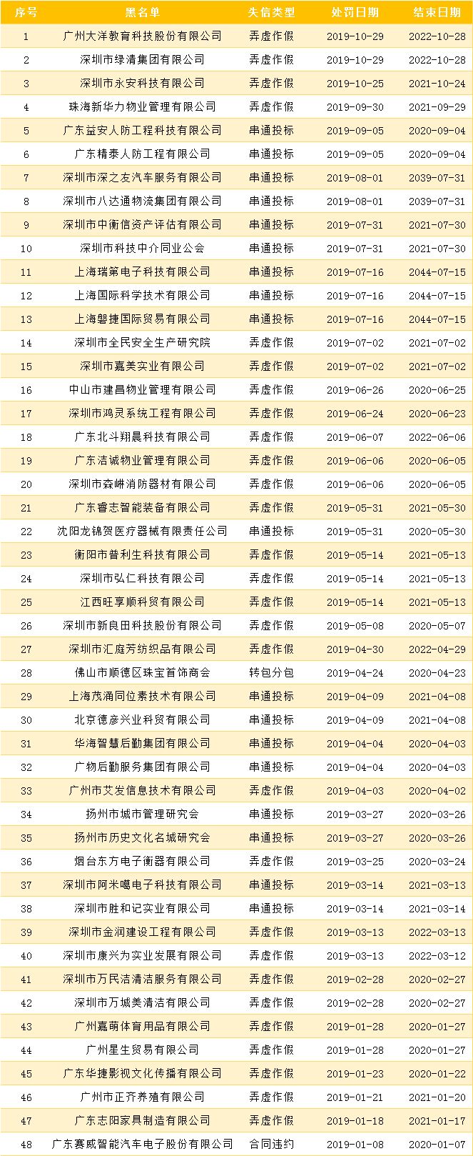 附:2019年1-10月广东省政府采购列入黑名单共计48家